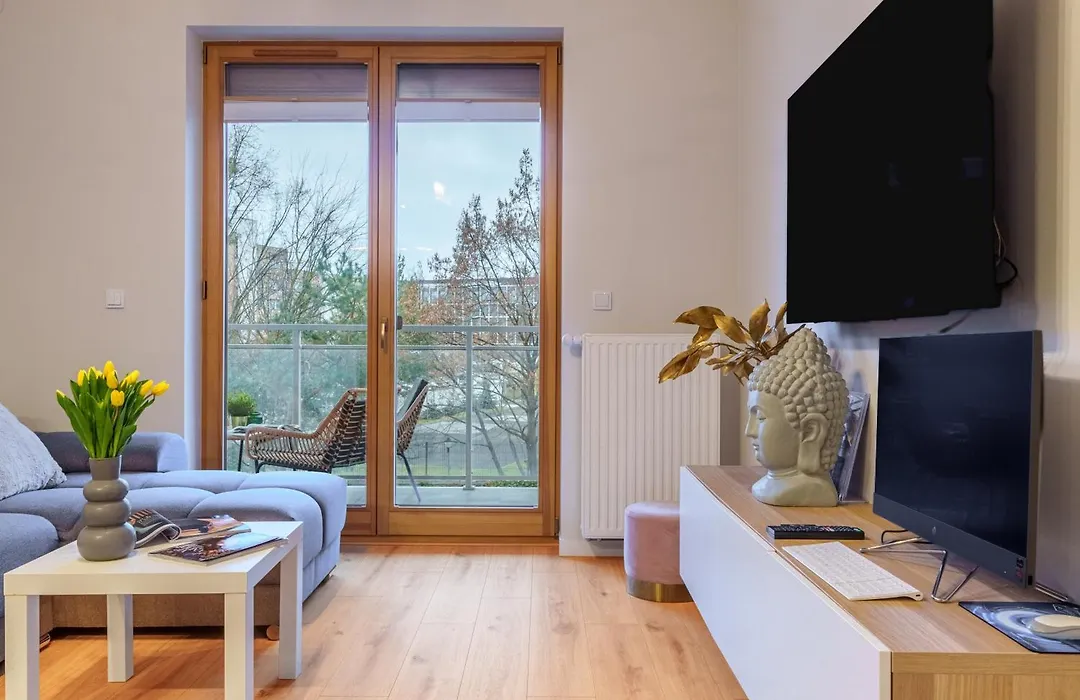 Das Piekny Apartament Bobrowiecka Z Balkonem bietet einen Ankleidebereich und eine Sitzecke mit schalldichten Wänden und einer Waschmaschine für höchsten Komfort. Diese Apartments verfügt über 1 Badezimmer. Ein Haartrockner, Badelaken und Hausschuhe sind ebenfalls vorhanden.